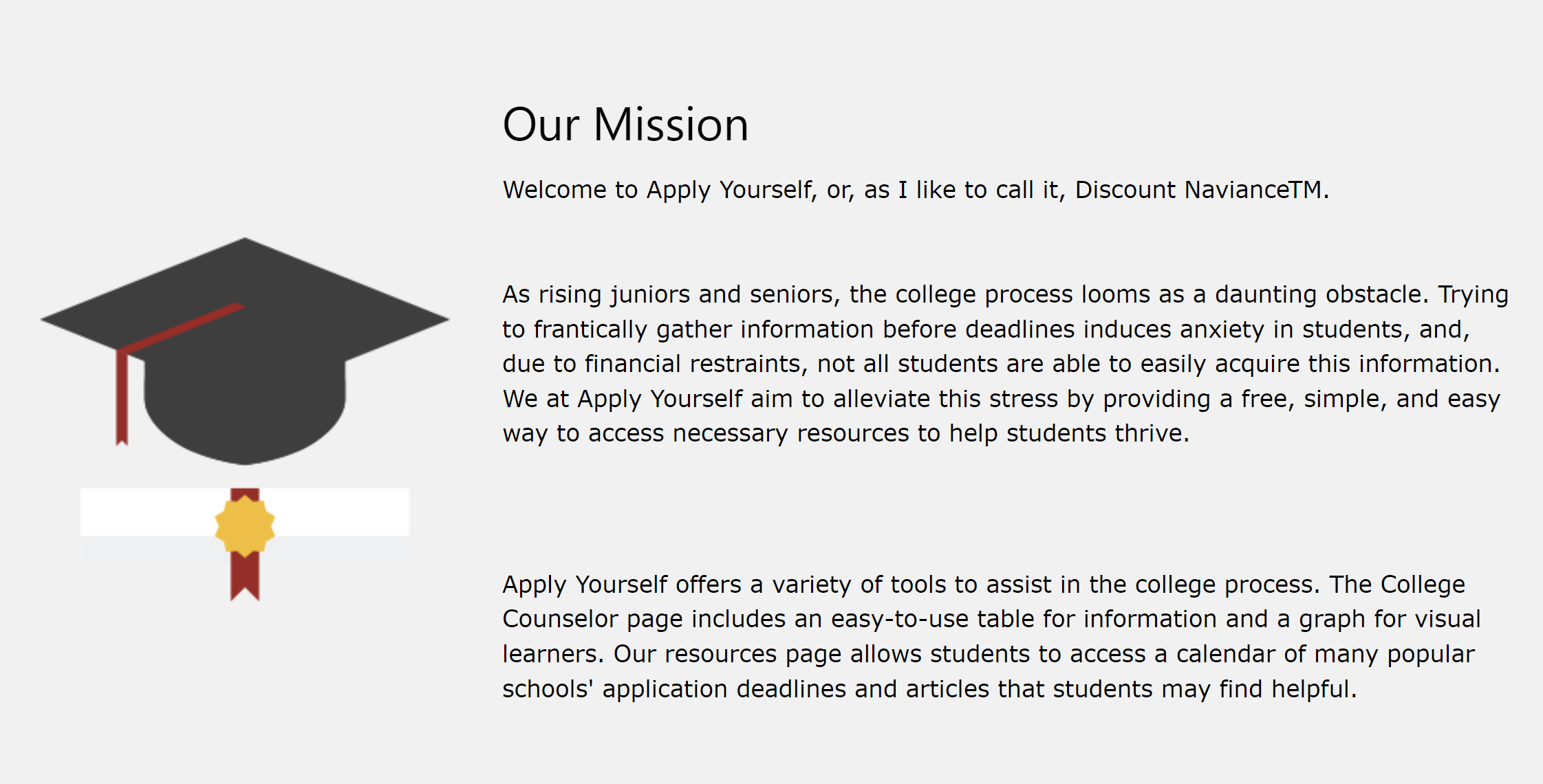 In the summer of 2019, I participated in the Girls Who Code Summer Immersion Program. For our final project, my team and I designed and programmed the web application Apply Yourself, a free and easy-to-use application intended to make the college application process more accessible to all. With a tech stack of pure HTML, CSS, and JavaScript, this was one of my first major coding projects, and my skills have only improved since.