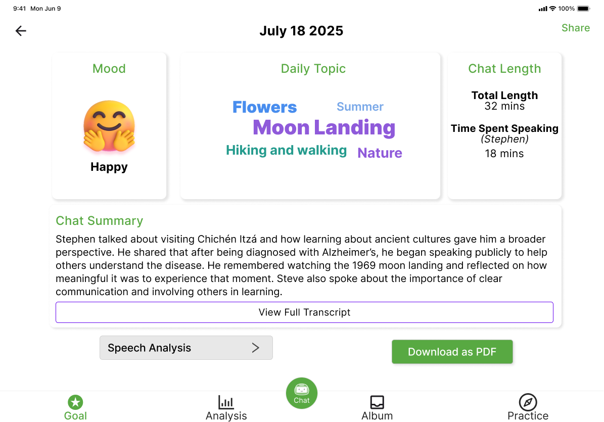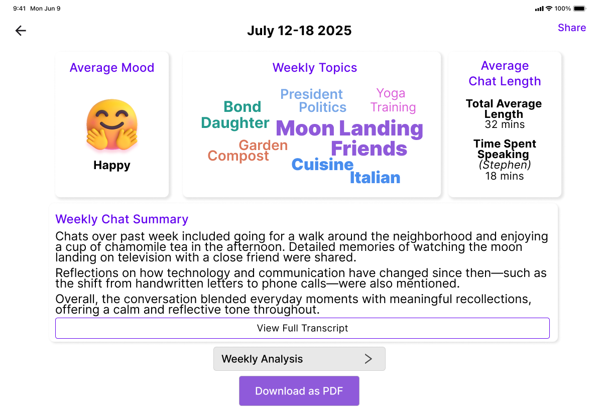 • Developed a React + Vite + TailwindCSS web application enabling dementia patients and caregivers to visualize conversational history, biomarker metrics, and care progress.